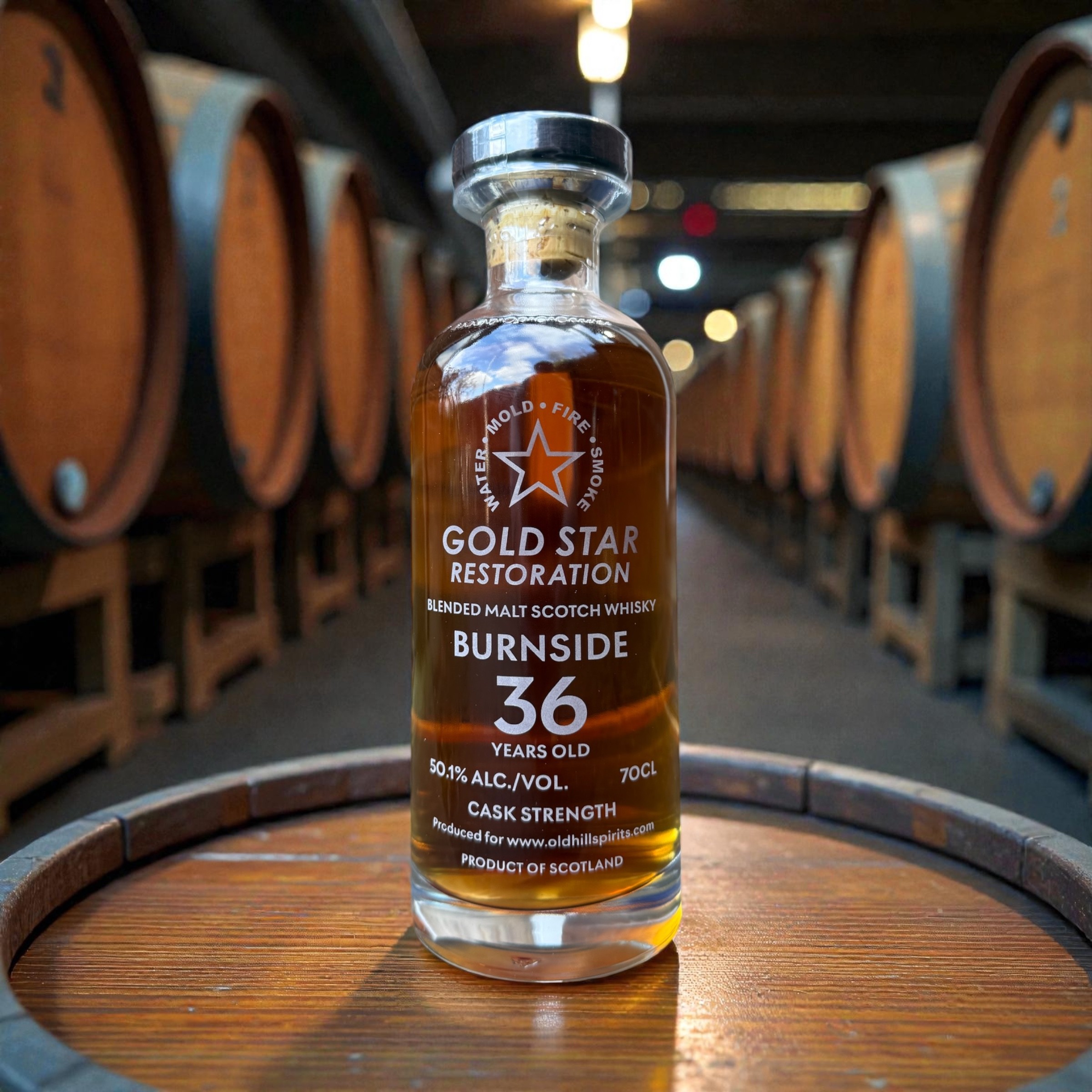 Commissioned by Gold Star Restoration as a distinguished corporate gift for valued clients, this exceptional 36-year-old Burnside Blended Malt was bottled at its natural cask strength of 50.1% ABV, yielding just 394 bottles. Distilled in Speyside and matured for over three decades, this rare whisky is presented without colouring or chill-filtration and housed within the stunning Glencairn Decanter, elevating both presentation and occasion. A remarkable marriage of age, provenance and Speyside character, with unmistakable influence from its origins at The Balvenie Distillery—a refined and memorable whisky chosen to reflect the craftsmanship and care synonymous with Gold Star Restoration.